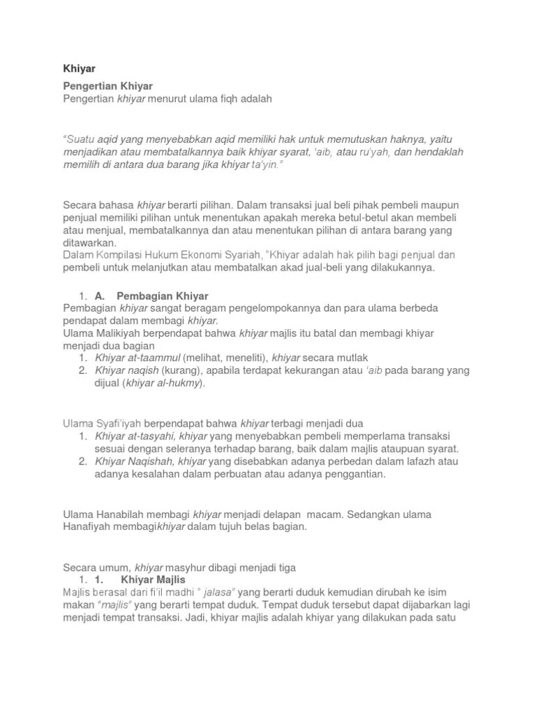 Pada saat akad jual beli, maka pembeli atau penjual dapat memilih atau meneruskan atau . Sebgai salah satu hak bagi kedua belah pihak yang meakukan transaksi (akad) ketika terjadi beberapa persoalan dalam transaksi yang dimaksud.18 secara . Hak khiyar yang melekad dalam akad (khiyar. Kompilasi hukum ekonomi syariah (khes) khiyâr adalah hak pilih bagi penjual dan pembeli untuk melanjutkan atau membatalkan akad jual beli yang dilakukannya. Secara etimologi pengertian khiyar adalah memilih.