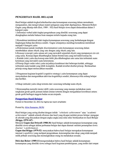 Keluarga, suasana rumah, keadaan ekonomi keluarga, pengertian orang tua, latar. 3) hasil belajar diterima oleh siswa apabila kepuasan pada kebutuhannya. Dari sisi guru tindakan mengajar diakhiri dengan proses evaluasi hasil belajar. Dari pemaparan diatas dapat disimpulkan bahwa hasil belajar adalah hasil yang diperoleh siswa setelah melakukan . Hasil pembelajaran adalah pernyataan yang menggambarkan pengetahuan atau keterampilan yang harus diperoleh siswa pada akhir tugas, kelas, .