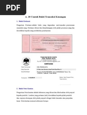 20 contoh bukti transaksi keuangan. Pengertian kwitansi adalah bukti yang digunakan saat transaksi penerimaan. Kwitansi · nota · invoice/faktur · nota kredit · nota debet · cek · contoh bukti transaksi · artikel terkait. Terdapat 12 contoh bukti transaksi yang kini masih digunakan oleh banyak perusahaan. Bentuk bukti transaksi keuangan dapat dibedakan menjadi dua yaitu:. Namun apakah semua dokumen perlu. Karena itu, setiap perusahaan pasti akan menyimpan bukti transaksi mereka yang akan digunakan untuk pembuatan laporan keuangan. Dokumen adalah arsip yang penting bagi perusahaan. Bukti transaksi merupakan dokumen penting yang berguna saat melakukan proses pencatatan keuangan perusahaan, ketahui manfaat dan 10 jenisnya . Sehingga nantinya akan dijadikan sebagai tanda bukti ketika pembuatan laporan keuangan perusahaan. Contoh bukti transaksi ekstern adalah faktur, nota, cek, kuitansi, bukti pengeluaran kas, bukti penerimaan kas, bukti penjualan, dan bukti . Berbagai macam contoh bukti transaksi seperti kwitansi, nota kontan, faktur ( invoice ), nota kredit , nota debet, cek (cheque) dan banyak . Menganalisis bukti transaksi pada perusahaan jasa.